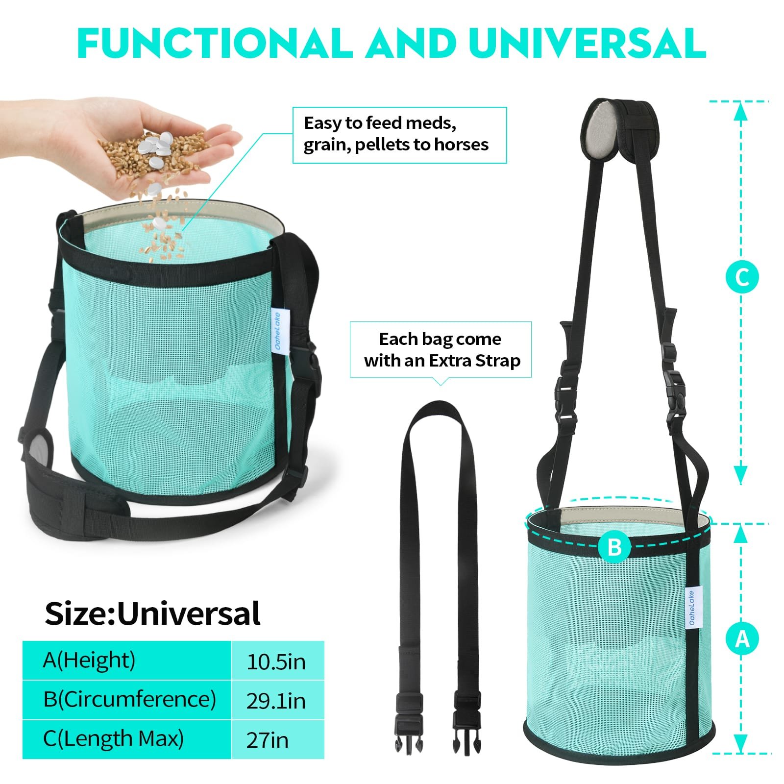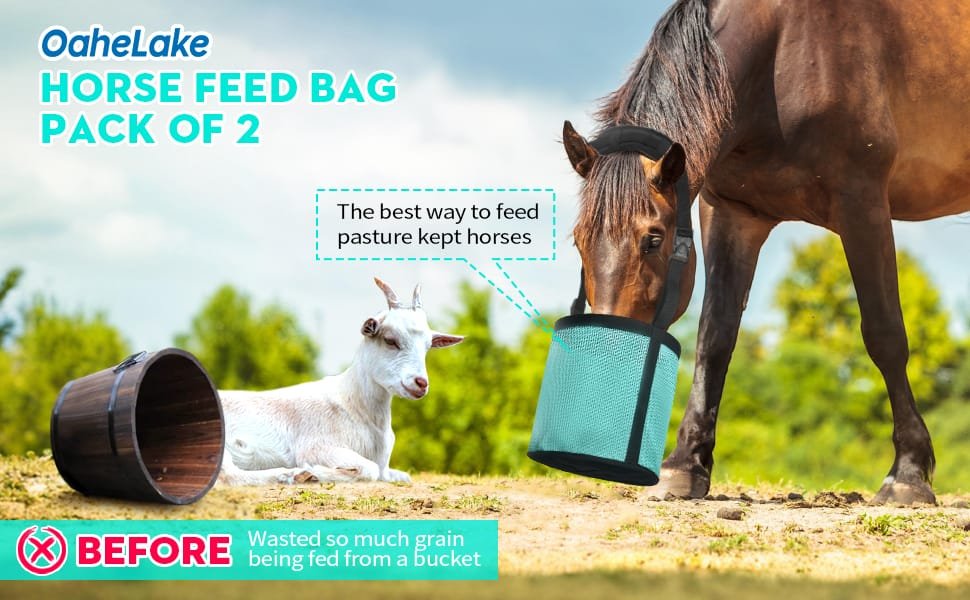 OaheLake horse feed bag is ideal for ensuring horses get every bite of their vital feed, preventing greedy pasture-mates from stealing rations and stop messy eater from wasting expensive feed and supplements.