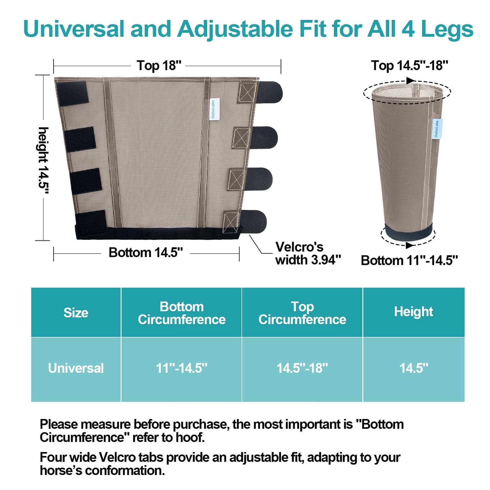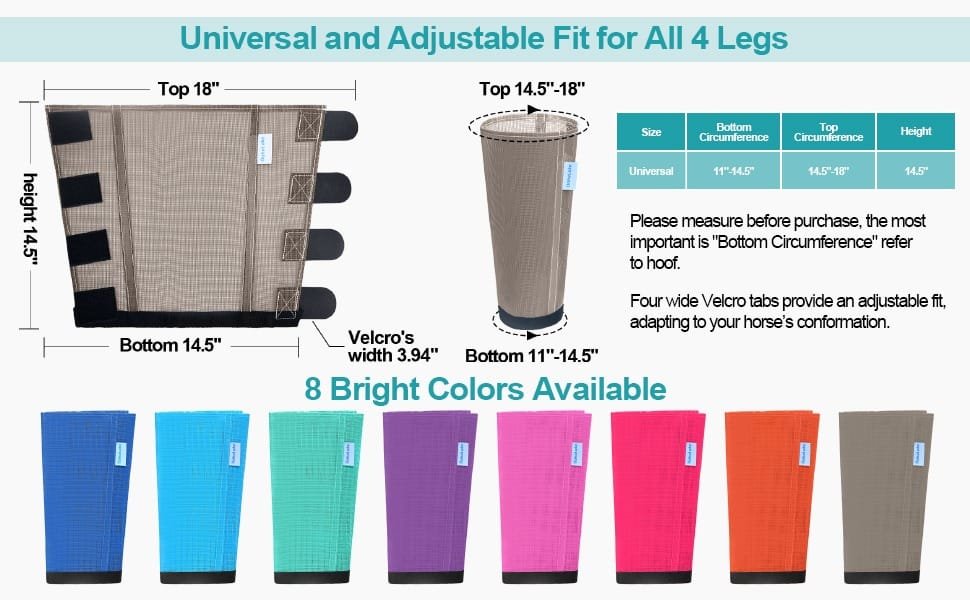 • UNIVERSAL SIZE & 8 COLORS AVAILABLE: OaheLake fly socks for horses have One universal size, 4 horizontal Velcros provide an adjustable fit, 3.94” wide enough to ensure adjustable fit for most of horses. 8 bright colors are available, set of 4, all 4 legs protected in one purchase. Contact OaheLake for assistance if any concerns arise.