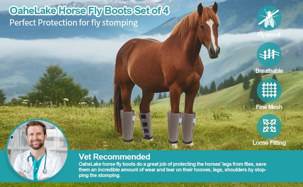 OaheLake Mesh Fly Boots For Horses are the perfect protection against flies. The lightweight plastic mesh keep the flies off while letting airflow circulate freely, Vet-trusted design prevent rubs and overheating, all four legs stays protected by OaheLake boots season after season.