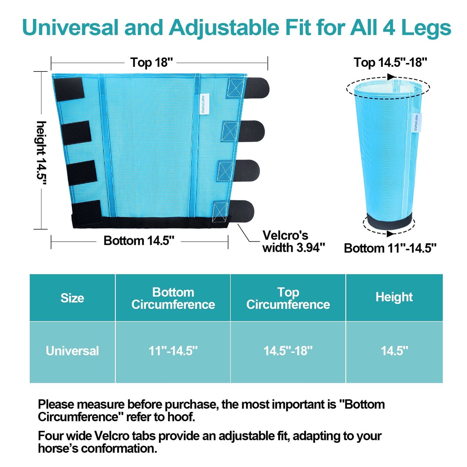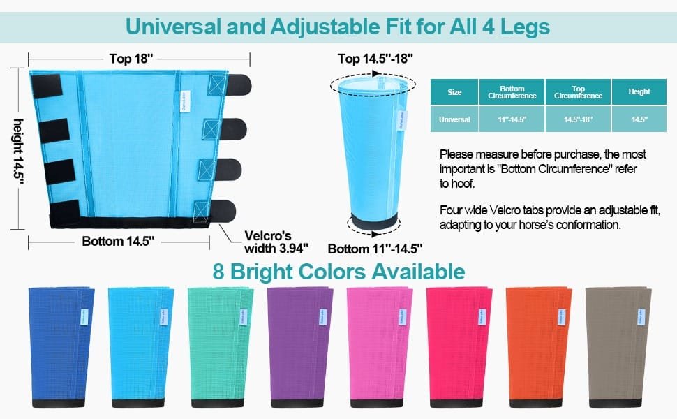 • UNIVERSAL SIZE & 8 COLORS AVAILABLE: OaheLake fly socks for horses have One universal size, 4 horizontal Velcros provide an adjustable fit, 3.94” wide enough to ensure adjustable fit for most of horses. 8 bright colors are available, set of 4, all 4 legs protected in one purchase. Contact OaheLake for assistance if any concerns arise.