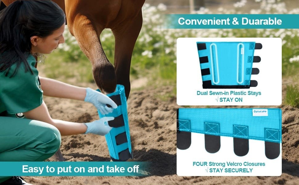 Quick-change Velcros secure all 4 legs faster. You can quickly adjust the fit on each leg, it is better than others as there are 4 Velcro tabs on these instead of just one long strip that you have to line up. Four Velcro can stay securely on the horse.